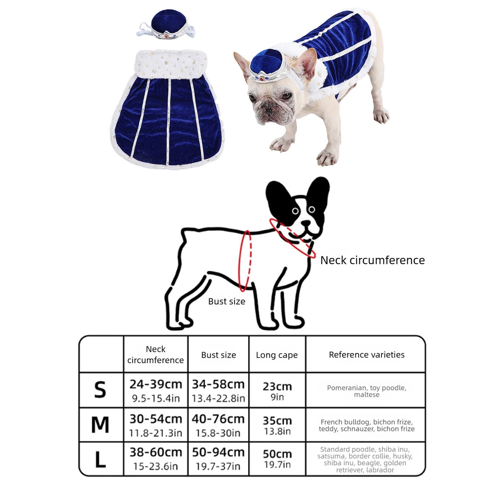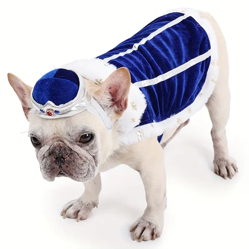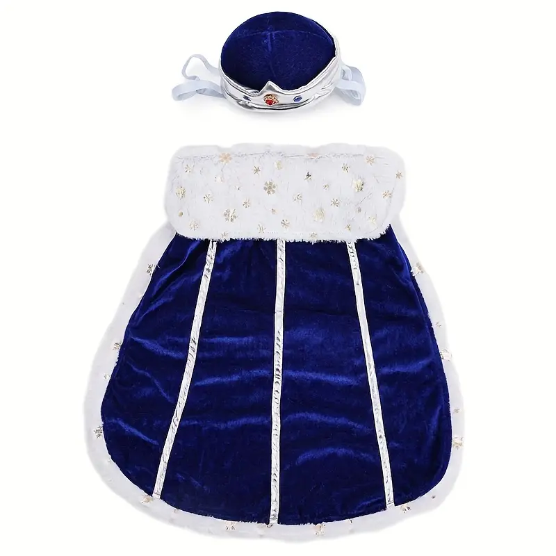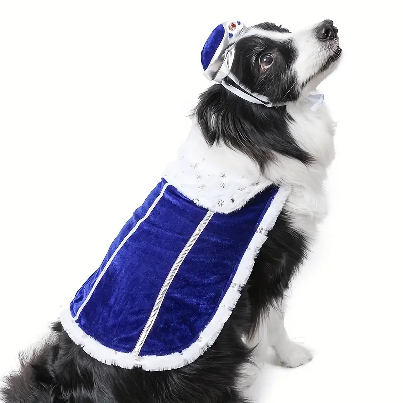 Το σετ περιλαμβάνει μια πολυτελή βασιλική κάπα και ένα καπέλο – σχεδιασμένα με λεπτομέρειες που θυμίζουν αυλική εμφάνιση, αλλά αρκετά απλά ώστε να μην δυσκολεύουν το κατοικίδιο. Το υλικό είναι απαλό, με κατάλληλη εφαρμογή για να μην πέφτει κατά τη διάρκεια της βόλτας.