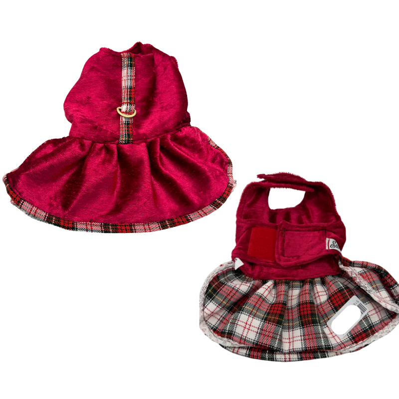 Κομψό επιστήθιο-φόρεμα για μικρό σκύλο ή γάτα, με βελούδινη υφή και διακριτικό καρό σχέδιο.