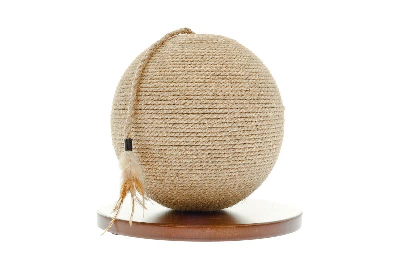 Ονυχοδρόμιο γάτας στρογγυλό με παιχνίδι φτερό στο πάνω μέρος που κρέμεται με σκοινί.