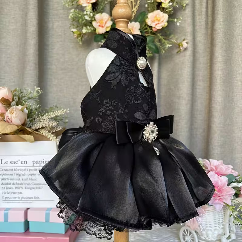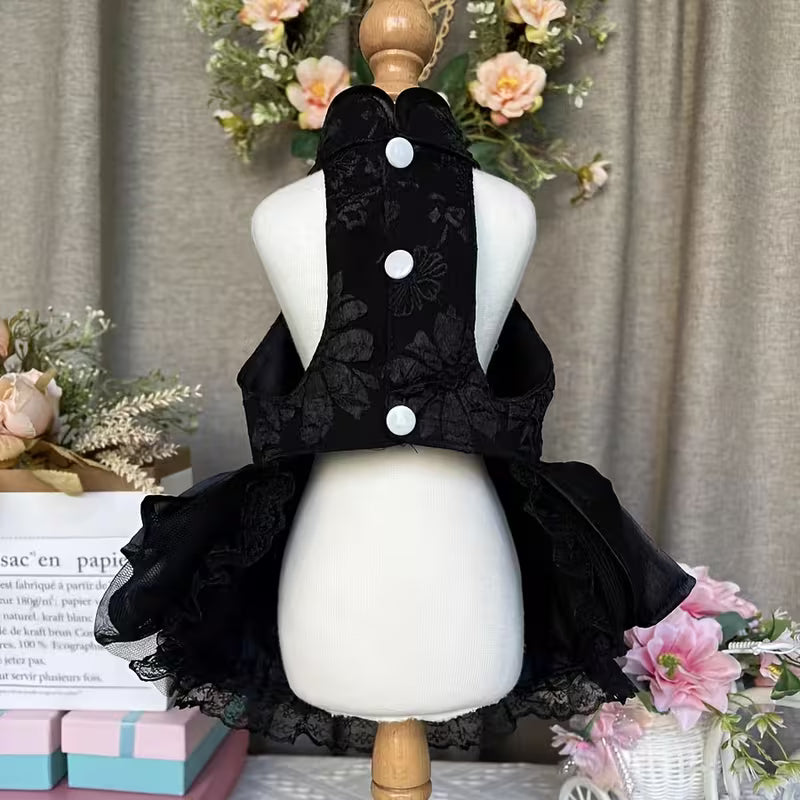 Kομψό φόρεμα πριγκίπισσας για μικρόσωμους σκύλους, με δαντελένιο επάνω μέρος και φούστα από τούλι σε μαύρο χρώμα 🐾. Σχεδιασμένο για ιδιαίτερες εμφανίσεις, συνδυάζει άνετη εφαρμογή και elegant αισθητική. Ιδανικό για μικρά σκυλάκια σε γιορτές, events και φωτογραφίσεις.