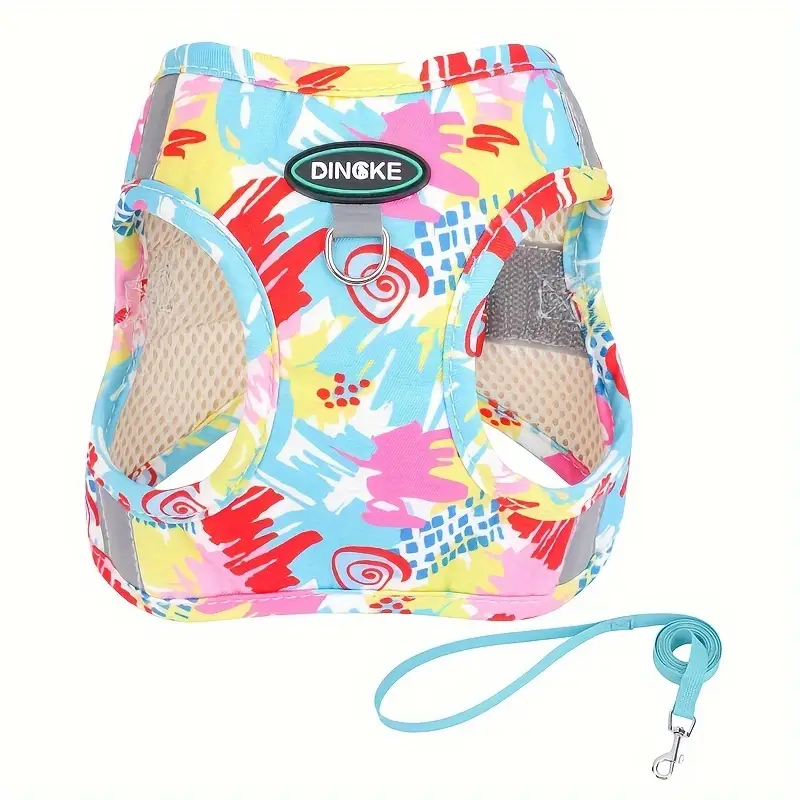 Όμορφο σετ λουρί-σαμαράκι σκύλου με πολύχρωμο σχεδιάκι! Εύκολο στη τοποθέτηση και φτιαγμένο από ύφασμα που αναπνέει για να κινείται το μικρό σας χωρίς καμία ενόχληση. Για ξέγνοιαστες βόλτες με ασφάλεια.