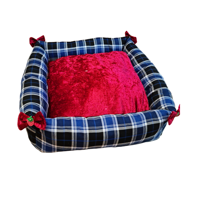 Κρεβατάκι σκύλου γάτας καρό με βελούδινο κόκκινο μαξιλάρι. Διακοσμητικοί φιόγκοι με φράουλες.
